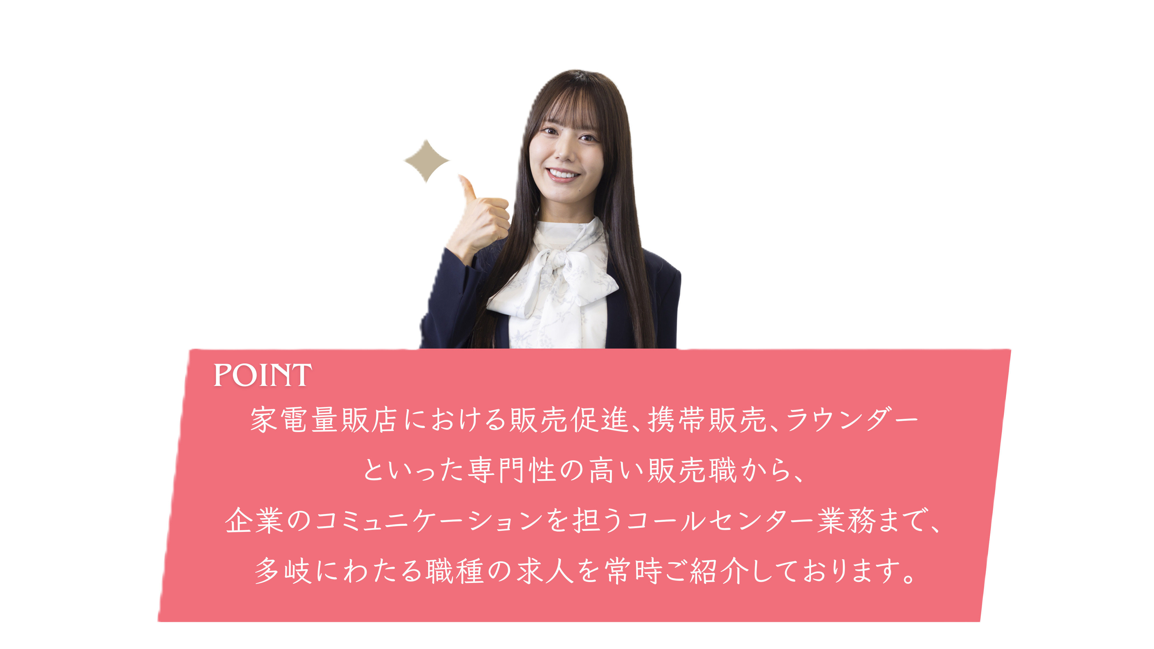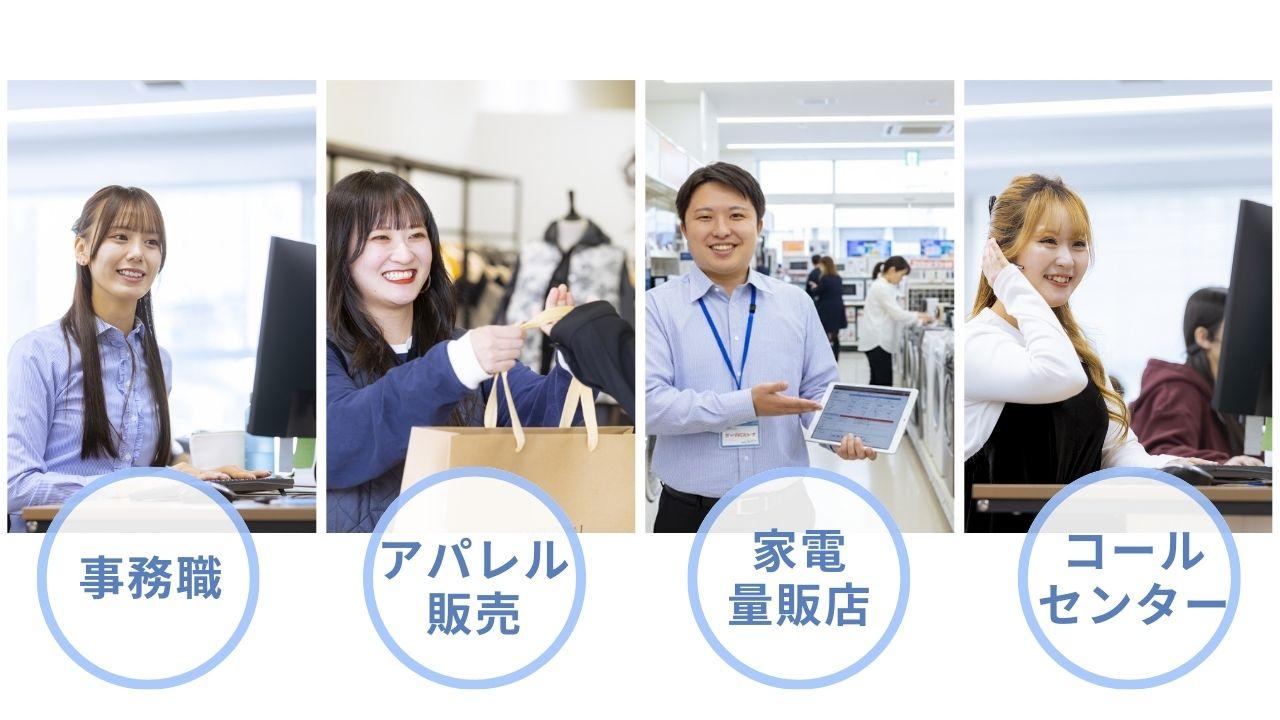 一般事務、経理事務、受付、システム(SE,AI)、販売、営業、人材コーディネーター、人事採用